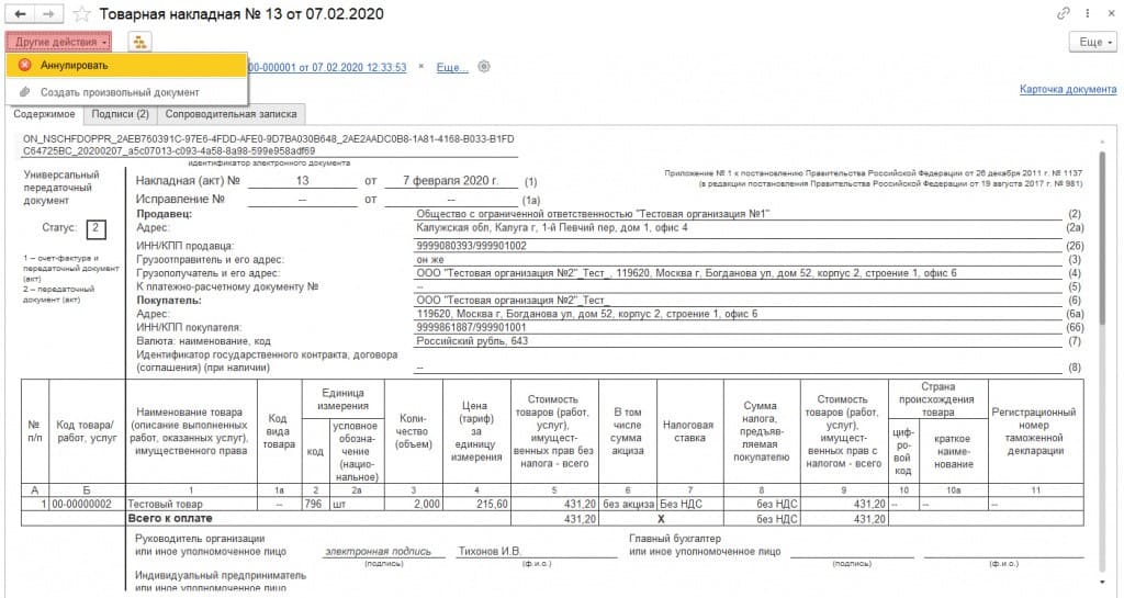 Для этого необходимо открыть соответствующий электронный документ, нажать «Другие действия», а затем «Аннулировать».