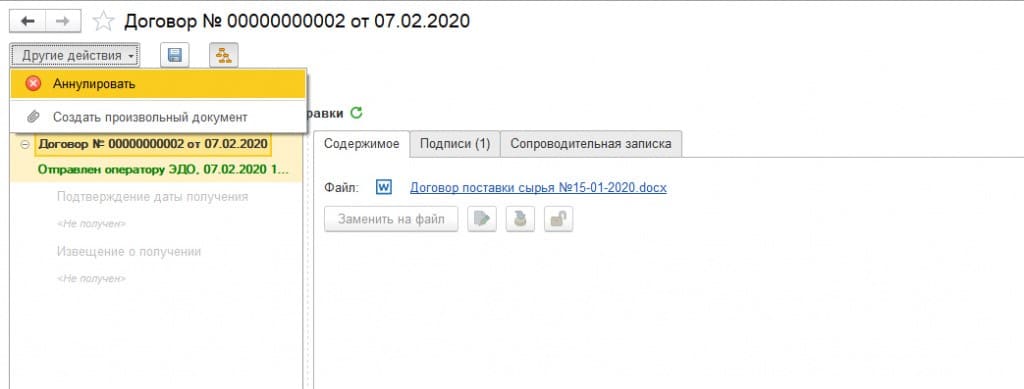Отправить запрос на аннулирование можно только один раз. Если получатель предложения об аннулировании отклоняет его, дальнейшее аннулирование документа возможно только с помощью произвольного документа или в судебном порядке. Подробнее об аннулировании электронного документа с помощью произвольного документа можно посмотреть тут — http://1c-edo.ru/handbook/28/3717/.