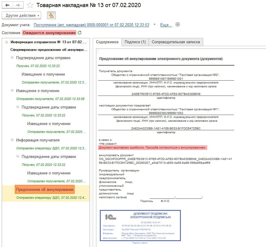 Сформированное предложение об аннулировании подписывается инициатором аннулирования и отправляется через оператора ЭДО контрагенту. Состояние ЭДО переходит в статус «Ожидается аннулирование».