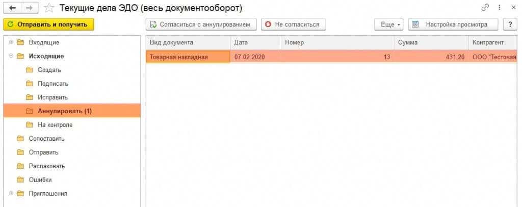 Также инициировать процедуру аннулирования возможно сразу после отправки электронного документа контрагенту. При таком сценарии, Ваш контрагент получит отправленный документ в папку «Аннулировать» раздела входящие Текущих дел ЭДО.