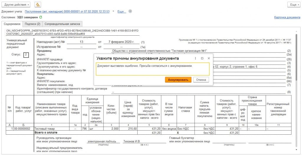 Если электронный документ выставлен ошибочно, то для лишения этого документа юридической значимости необходимо провести процедуру его аннулирования.