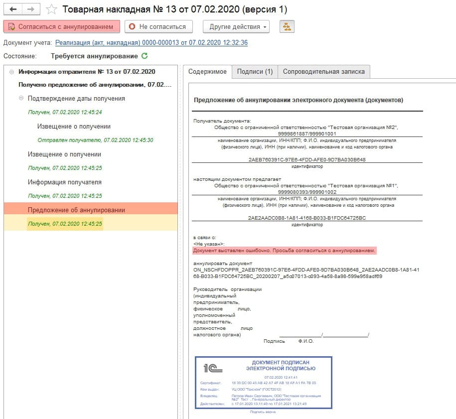 Контрагент может открыть соответствующий документ и ознакомиться с информацией в предложении об аннулировании.