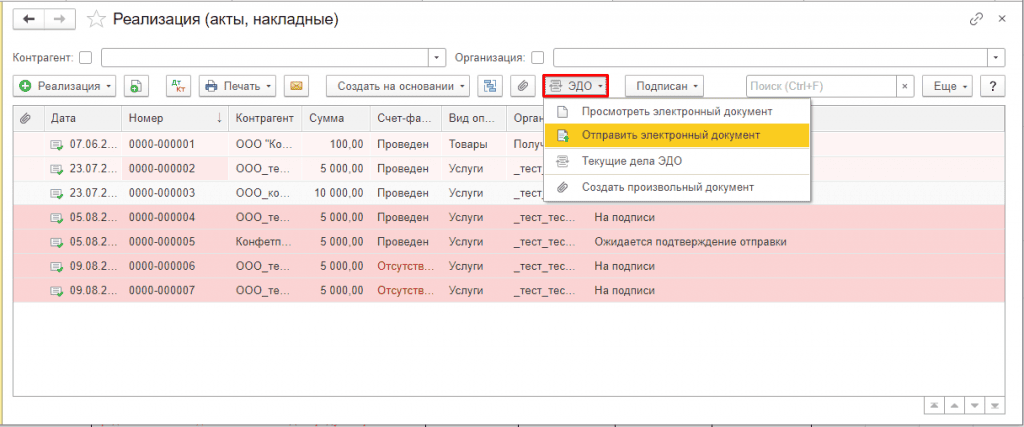 При выполнении команды Отправить электронный документ меню ЭДО в таблице списка документов реализаций: