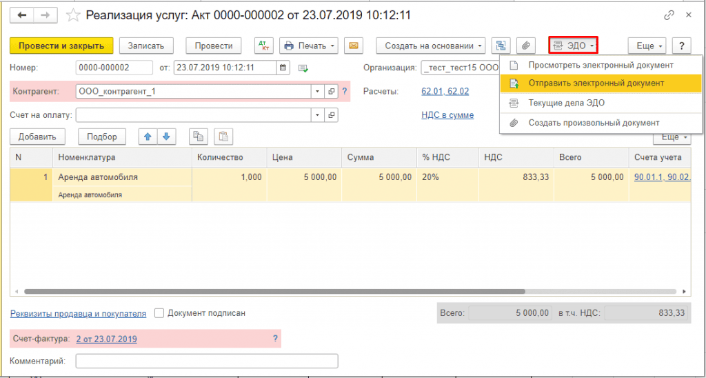 При выполнении команды Отправить электронный документ меню ЭДО в карточке документа информационной базы:
