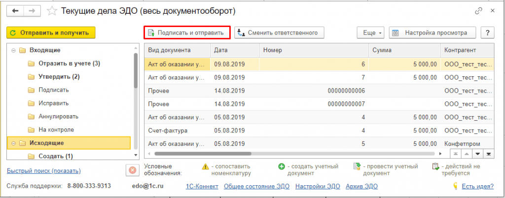 При выполнении команды Подписать и отправить из папки Исходящие страницы Текущие дела ЭДО, открываемой по гиперссылке панели команд Текущие дела ЭДО (раздел Администрирование - подраздел Сервис или раздел Руководителю - подраздел Сервис, или раздел Покупки - подраздел Сервис):