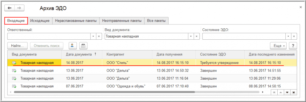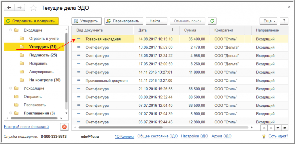 Полученный электронный документ, в зависимости от типа, может автоматически помещаться в папку «Утвердить» формы списка документов «Текущие дела ЭДО»: