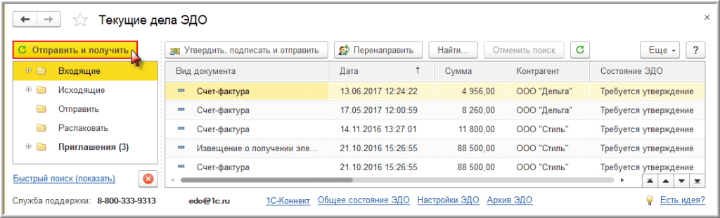 Получение электронных документов производится при выполнении команды Отправить и получить из формы списка документов «Текущие дела ЭДО» , открываемого по гиперссылке панели команд Текущие дела ЭДО (раздел Продажи - подраздел Сервис или раздел Покупки - подраздел Сервис):