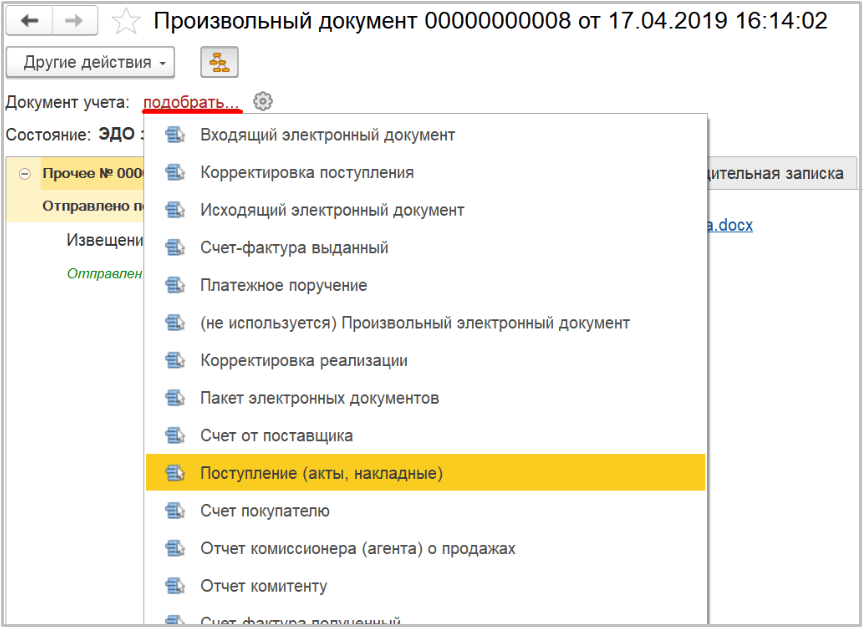 После создания документа поступления, его можно прикрепить к входящему электронному документу со страницы электронного документа. Для этого пользователю необходимо отрыть страницу электронного документа и нажать ссылку «Подобрать», а затем выбрать уже созданный документ информационной базы:
