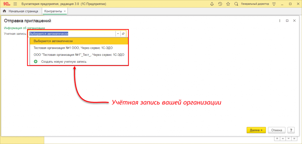 Учётную запись вашей организации можно сменить как для определённого получателя, выбрав в соответствующем поле необходимое значение, так и для всех контрагентов: