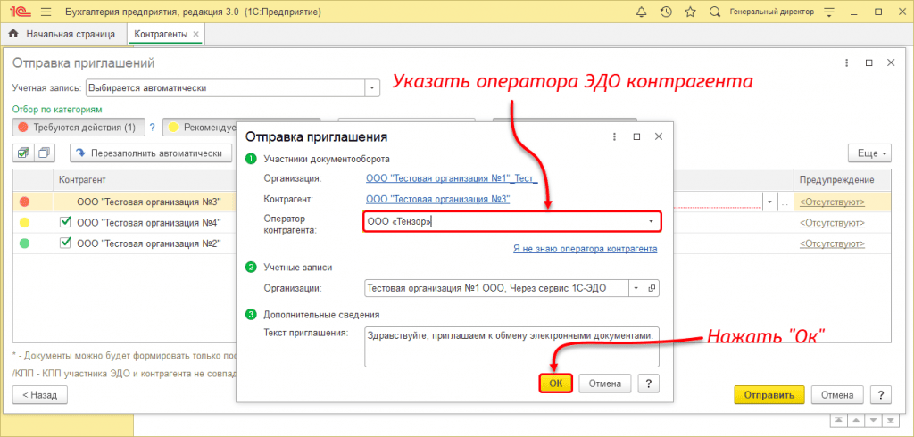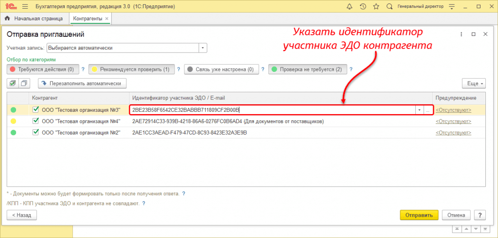 Откроется окно отправки приглашений, в котором система проверит наличие данных о контрагенте в сервисе и предложит пользователю выполнить определённые действия, которые разграничены цветовыми индикаторами.