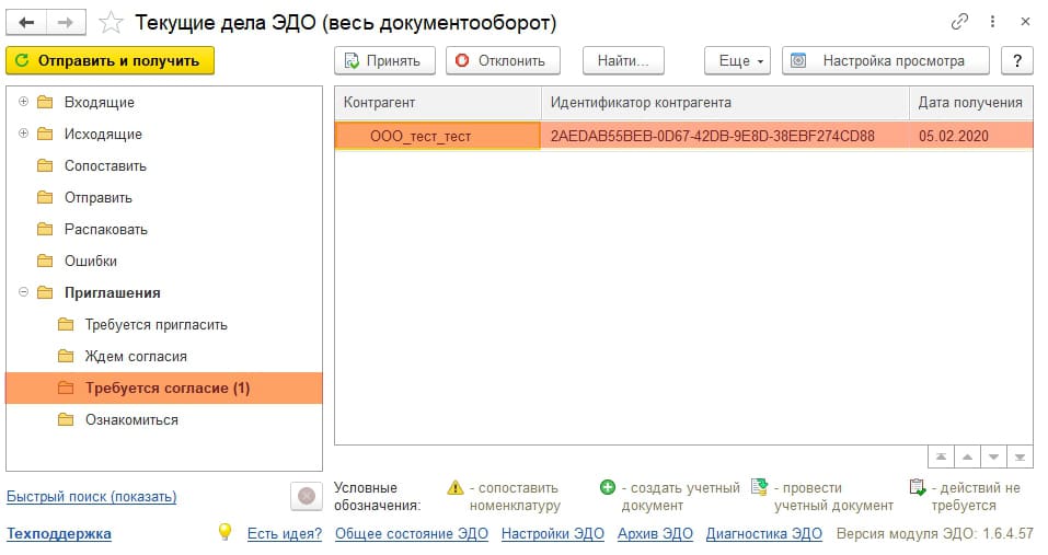 Для последующей работы с данным контрагентом необходимо согласиться с приглашением, нажав кнопку «Принять».