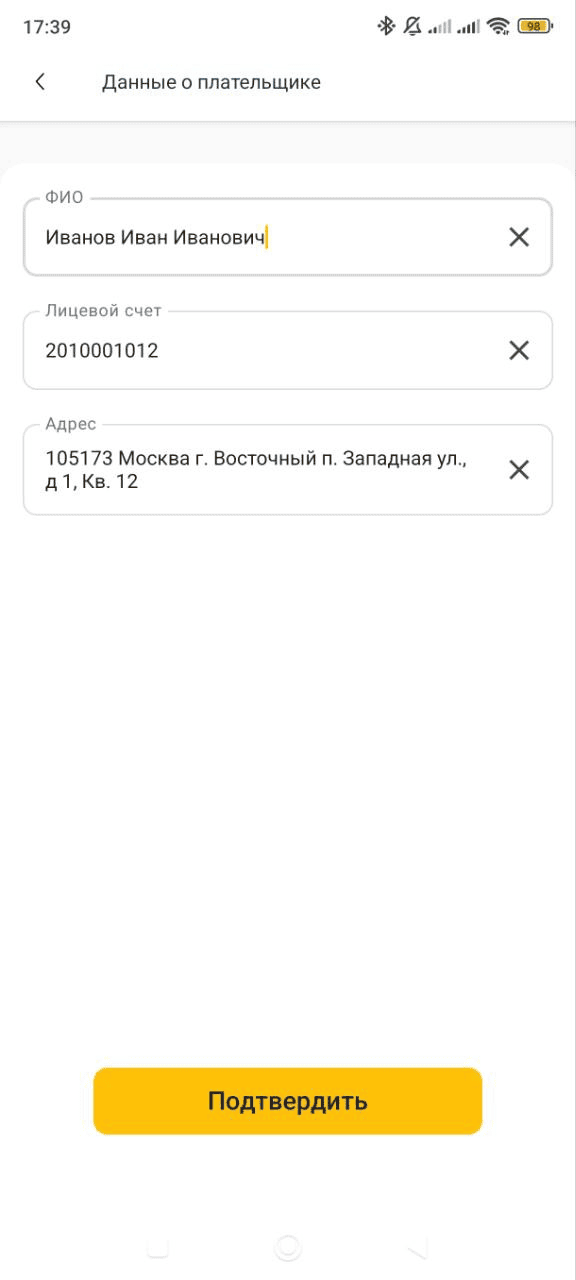 Шаг 3. Введите ФИО плательщика и проверьте адрес и номер лицевого счета, нажмите «Подтвердить»: