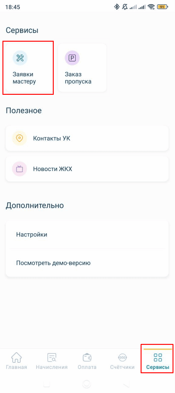 В разделе «Заявки мастеру» можно отправить заявку в аварийную службу Управляющей организации, например, заявку на ремонт или сообщение об аварии. Для этого: