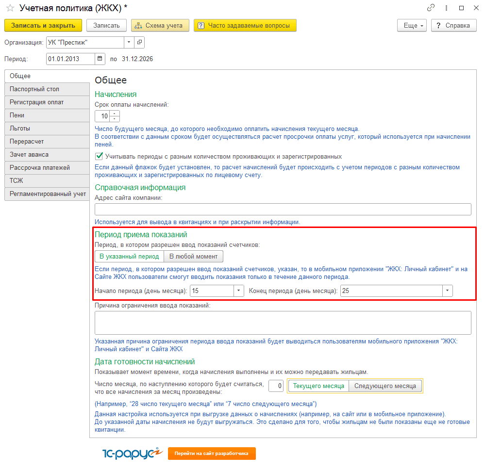 Настройте ограничение дат ввода показаний, перейдя по ссылке в Учетную политику ЖКХ: