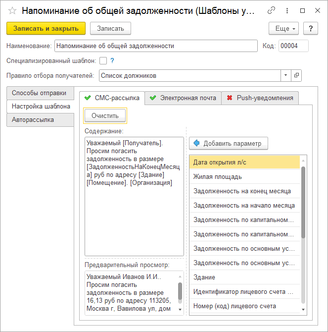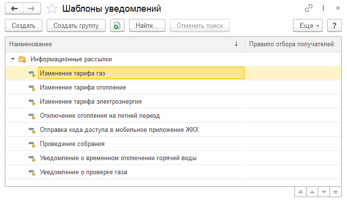 В программе доступны уже готовые шаблоны сообщений: уведомления жильцам по отправленным квитанциям, уведомления о задолженности, информационные рассылки.