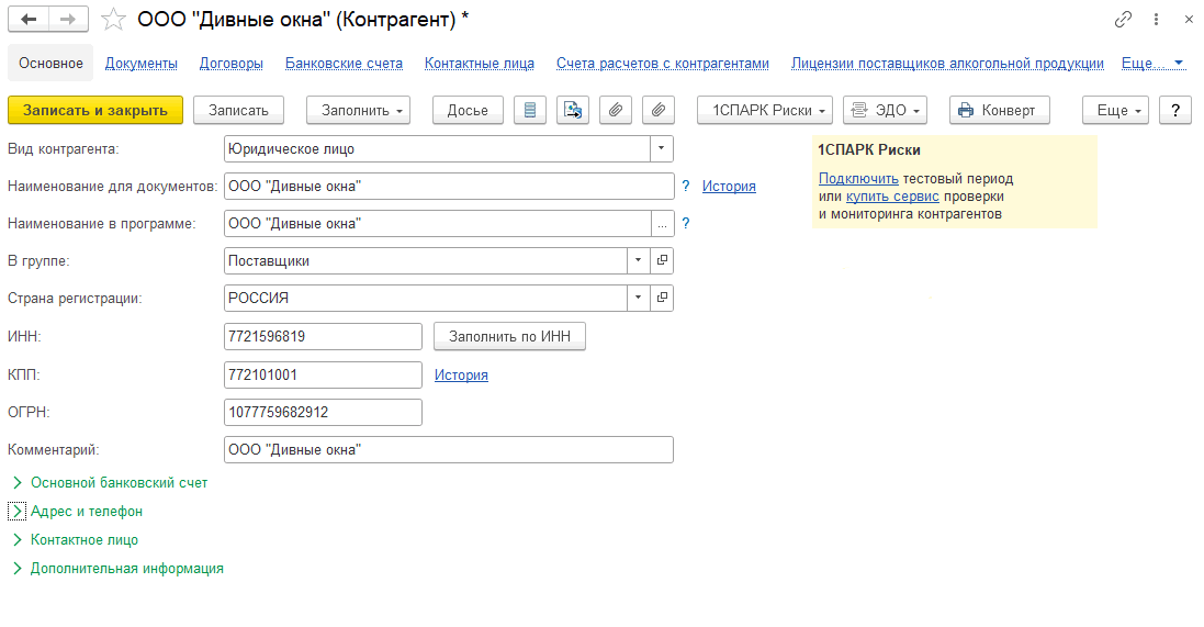 Доступно автоматическое заполнение реквизитов контрагента по ИНН с помощью сервиса 1С:Контрагент.