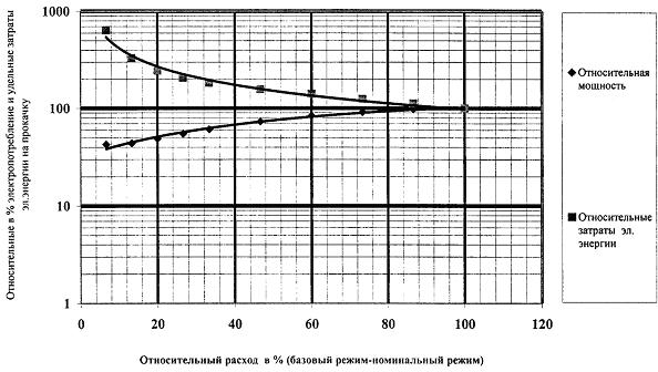 Рис. 20. Относительные значения в % электропотребления и удельных затрат электроэнергии на прокачку насосом 12Д-9, мощностью 160 кВт, расходом 900 м3/ч, при поддержании дросселированием давления в сети напора 6 ати