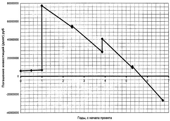 По второй схеме анализа строится график погашения кредита, полученного на реализацию энергосберегающего проекта, при заданной процентной банковской ставке и экономическом эффекте, направляем на погашение кредита.