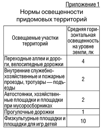 2.12. Территория дворов жилых зданий должна быть освещена в вечернее время суток. Нормы освещенности приведены в приложении 1 к настоящим санитарным правилам.