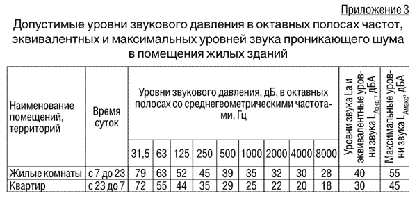 6.1.2. Допустимые уровни звукового давления в октавных полосах частот, эквивалентных и максимальных уровней звука проникающего шума в помещения жилых зданий следует принимать по приложению 3 к настоящим санитарным правилам.