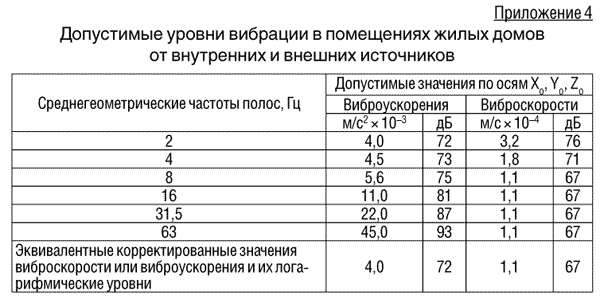 6.2.3. В помещениях жилых домов уровни вибрации от внутренних и внешних источников не должны превышать величин, указанных в приложении 4 к настоящим санитарным правилам.