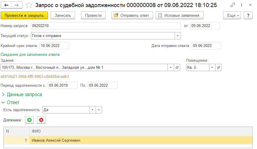 В документе «Запрос о судебной задолженности» фиксируется информация из запроса с ГИС ЖКХ, в ответ пользователь должен указать признак наличия задолженности и перечислить должников, если они имеются.