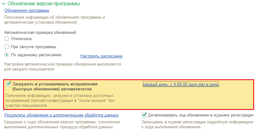 Чтобы начать загружать патчи автоматически, необходимо включить настройку «Загружать и устанавливать исправления (быстрые обновления) автоматически» (Администрирование -> Интернет-поддержка и сервисы-> Обновление программы), а также установить время для загрузки.