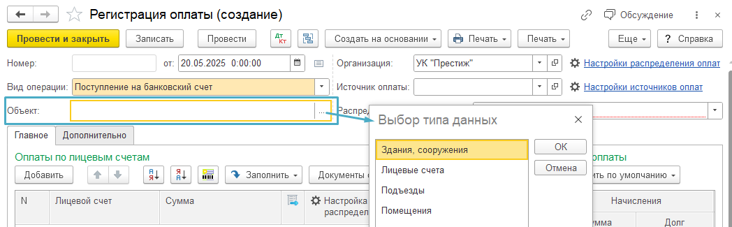 В документе «Регистрация оплаты» заполнять табличную часть лицевыми счетами стало удобнее! Для этого поле «Здание» было заменено на поле «Объект», при работе с которым можно выбрать наиболее подходящий тип отбора данных.