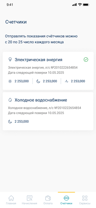 Отметка, что показание передано, рядом с прибором учёта в разделе «Счётчиков».