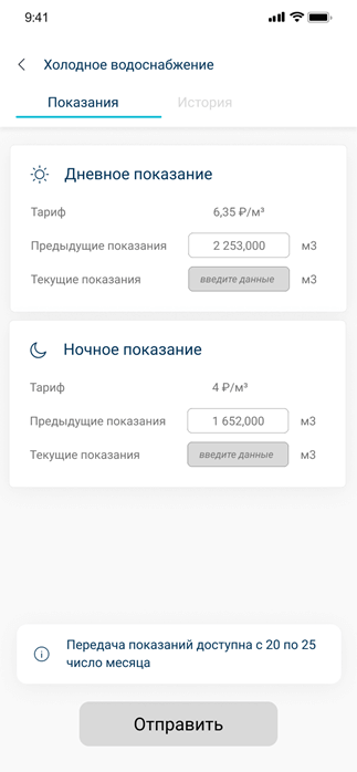 Пуш-уведомление в первый день и напоминание о необходимости передачи показаний на главной странице;