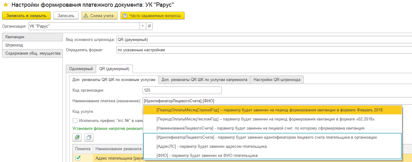 Расширены настройки формирования назначения платежа в QR-коде платежного документа. Теперь можно добавить такие параметры, как: ФИО и Адрес плательщика, Идентификатор лицевого счета.