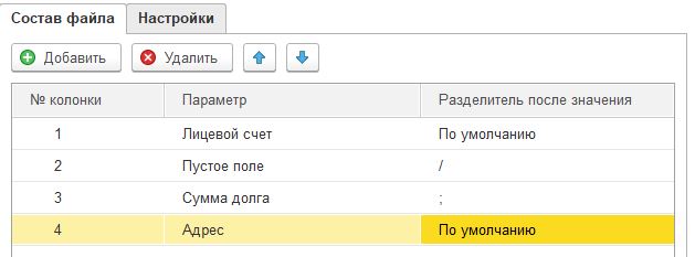 добавлена возможность настроить состав параметров для выгрузки сведений по услугам («Код услуги», «Наименование услуги», «Сумма долга») в раздельных колонках, либо через символ-разделитель. Для выгрузки сведений по услугам необходимо добавить параметр «Счетчики и услуги» и значение настройки «Выгружать сведения по» изменить на значение «Услугам».