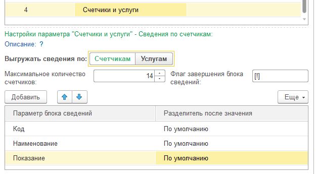 расширены возможности по настройке состава параметров для выгрузки сведений о показаниях приборов учета. Теперь можно выгружать параметры счетчика («Заводской номер», «Идентификатор», «Код», «Наименование», «Номер счетчика в ГИС ЖКХ») в отдельных колонках, либо через символ-разделитель в одной строке сведений по лицевым счетам. При этом параметр «Счетчик и показание» переименован в «Счетчики и услуги», и для данного параметра изменён состав настроек. Для выгрузки сведений о показаниях приборов учета необходимо значение настройки «Выгружать сведения по» изменить на значение «Счетчикам»: