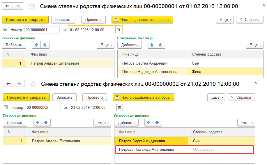 В документе «Смена степени родства физических лиц» добавлена возможность отменить родство между физическими лицами, установленное ранее. Например, после расторжения брака между супругами нужно указать, что одно физическое лицо больше не является женой другого физического лица. Для этого поле «Степень родства» в табличной части «Связанные физлица» нужно оставить незаполненным.
