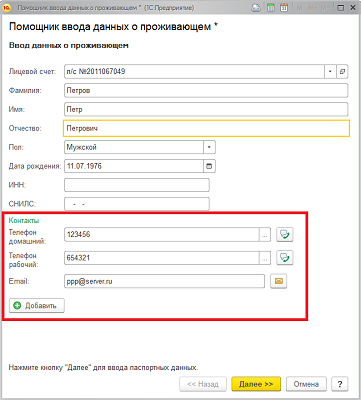 В помощник ввода данных о проживающем добавлена группа «Контакты» для внесения номеров телефонов и адреса электронной почты проживающего.