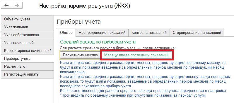 Добавлен новый вариант расчета среднего расхода прибора учета для начисления услуг по показаниям приборов учета – для расчета среднего расхода брать месяцы, предшествующие месяцу ввода последних показаний по прибору учета.