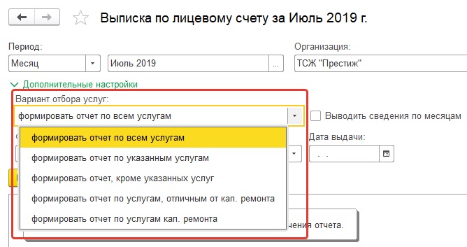 В отчете «Выписка по лицевому счету» добавлена гибкая возможность отбора услуг. Для этого на форму отчета добавлена настройка «Вариант отбора услуг». С подробной информацией можно ознакомиться в справочной информации.