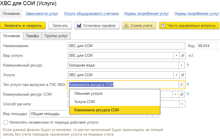 Если указано, что услуга является услугой СОИ, все начисления по данной услуге будут считаться начислениями за СОИ при выгрузке в ГИС ЖКХ.