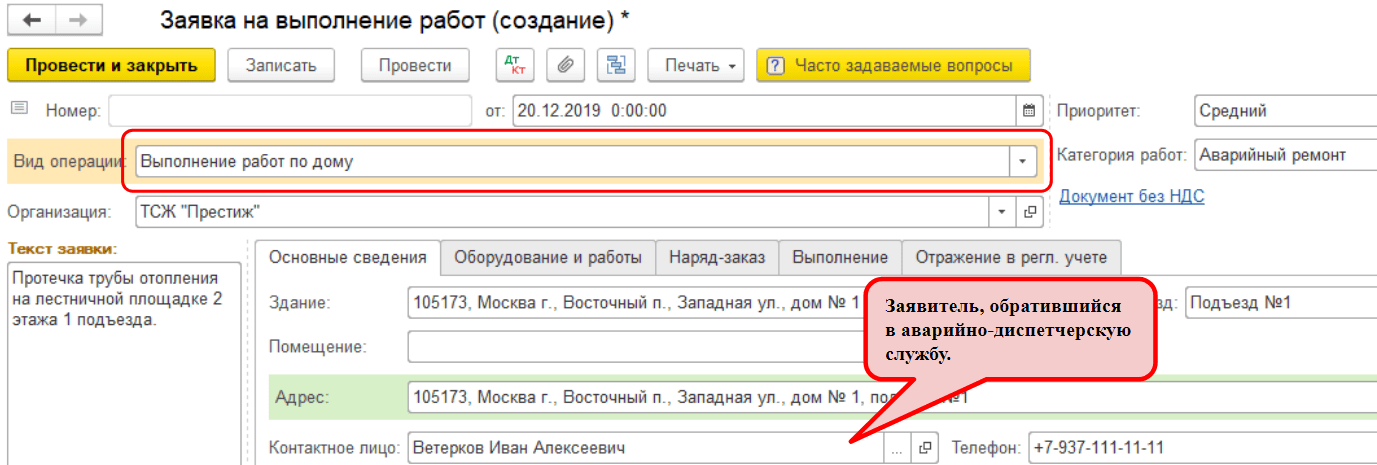 В документе «Заявка на выполнение работ» с видом операции «Выполнение работ по дому» добавлена возможность указывать контакты заявителя, это может потребоваться для его уведомления при закрытии обращения. В качестве заявителя можно указать жильца, контактное лицо организации или просто произвольное имя, например, если организация ведет упрощенный учет жильцов.