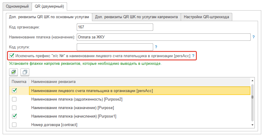 Добавлена дополнительная настройка вывода информации о лицевом счете плательщика в QR-штрихкод квитанции. Теперь в настройках можно исключить префикс «л/с №» из наименования лицевого счета, например, лицевой счет с наименованием «л/с №001» будет выводиться в штрихкоде со значением «001». Настройка вывода информации в QR-штрихкод квитанции доступна в разделе «Главное – Настройки ЖКХ – Настройки формирования платежного документа».