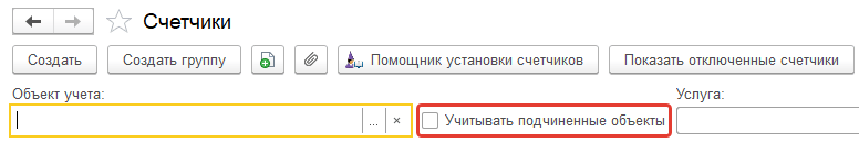 В форме списка справочника «Счетчики» добавлена возможность отбора приборов учета, установленных на указанный объект учета (здание, подъезд, помещение или лицевой счет). При этом с помощью флага «Учитывать подчиненные объекты» можно учесть приборы учета, установленные на связанные объекты (например, если в качестве объекта учета для отбора указан подъезд, то можно увидеть приборы учета по всем помещениям этого подъезда и лицевым счетам, открытым на помещения этого подъезда).
